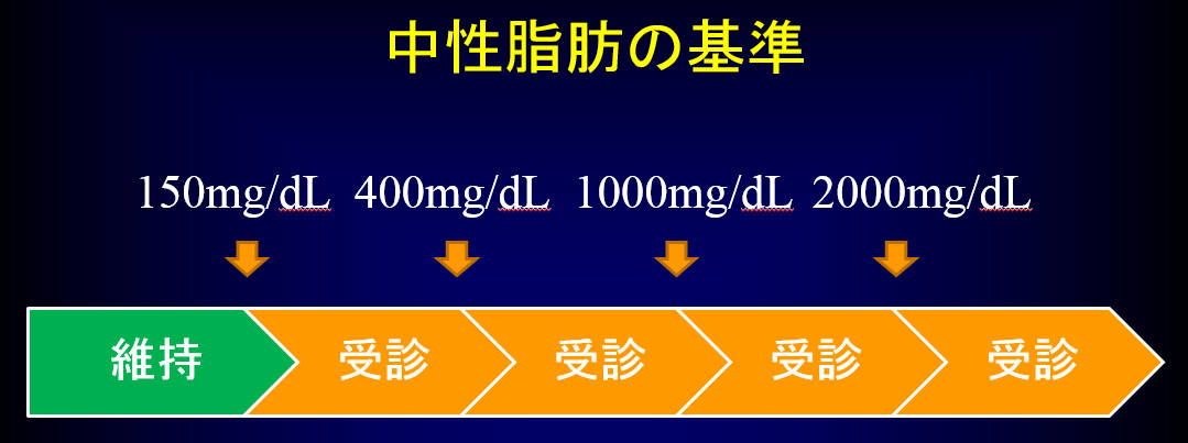 中性脂肪は150mg/dL以上で脂質異常症の診断となり、定期受診が必要です。400mg/dL以上で薬を検討しますが、中性脂肪は生活習慣の影響を大きく受けるため、基本的には栄養指導が主体の治療となります。