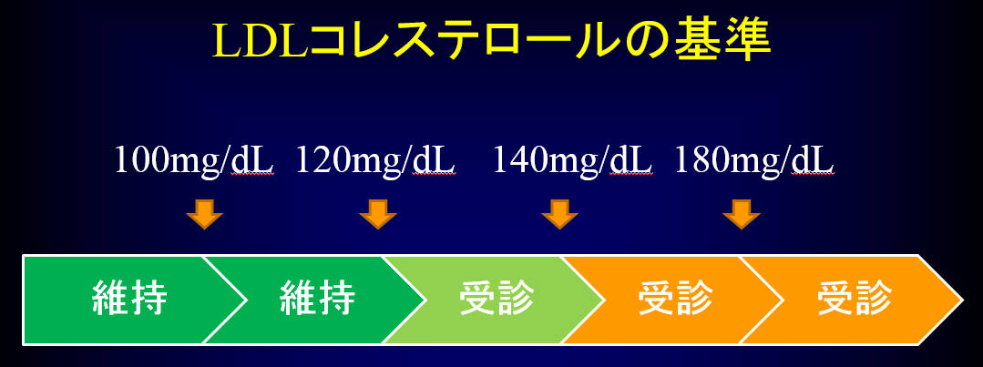 LDLコレステロールは140mg/dL以上で脂質異常症の診断となり、定期受診が必要です。180mg/dLの場合は家族性高コレステロール血症の可能性があり、動脈硬化の検査が必要となります。