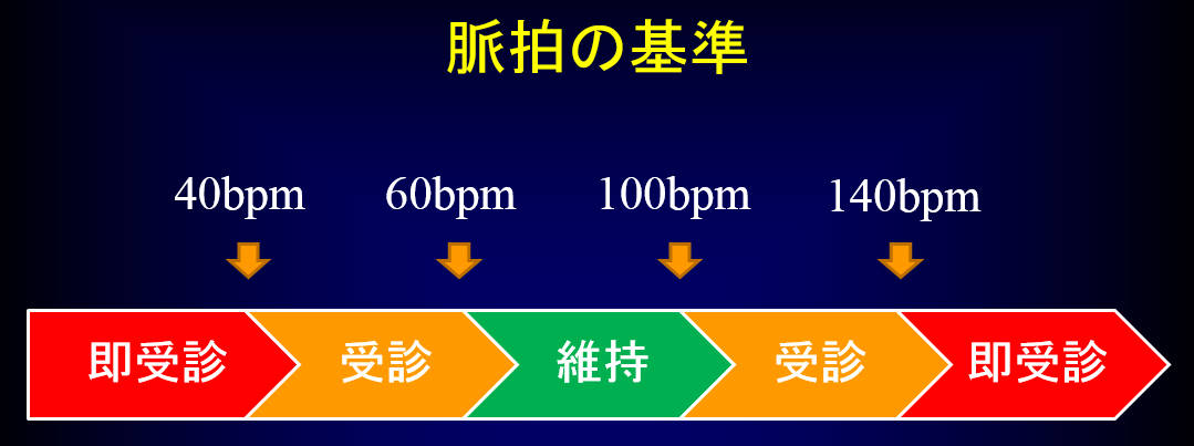 安静時の脈拍100bpm以上の場合は心電図を行い、必要に応じて心エコーの検査を追加します。40bpm以下、140bpm以上の場合は生命に関わる可能性があるため、速やかに受診して下さい。