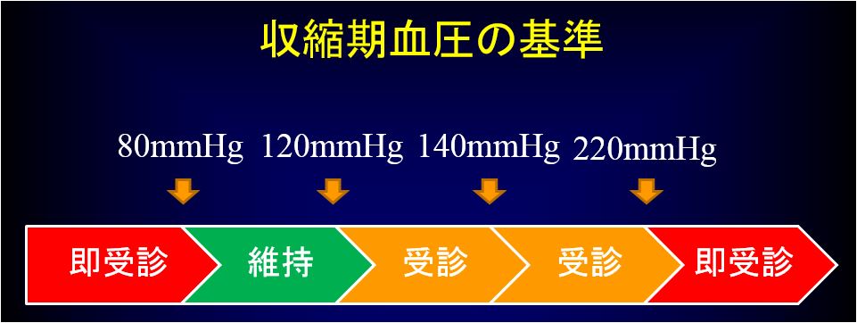 高血圧ガイドラインの改訂に伴い、収縮期血圧120-129mmHgは3-6ヶ月ごと、130-139mmHgは1-3ヶ月ごと、140mmHg以上は1ヶ月ごとの受診が推奨されるようになりましたので、収縮期血圧120mmHg以上の患者様は当院までご相談下さい。