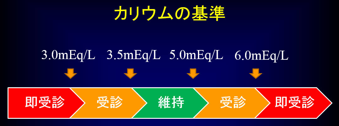 カリウムは致死的不整脈の原因となるため、注意が必要です。カリウムが3.5-5.0mEq/Lの範囲にない場合は定期受診が必要です。3.0mEq/L以下、 6.0mEq/L以上の場合は速やかに受診して下さい。