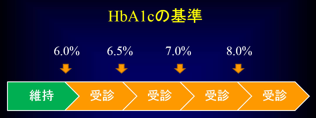 HbA1cは6.0%以上で境界型、6.5%以上で糖尿病の診断となり、定期受診が必要です。HbA1c 7.0%以上は中等症、HbA1c 8.0%以上は重症と評価されます。糖尿病の患者様は可能な限り専門医を受診して下さい。