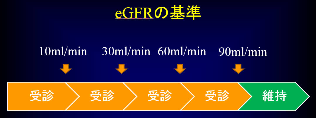 eGFRは腎機能を示す重要な指標であり、eGFR 60-90ml/minで尿蛋白陽性の場合、eGFR 60ml/min以下の場合は腎機能低下の診断となり、定期受診が必要です。三浦市ではeGFRを算出している医療機関は少ないようです。